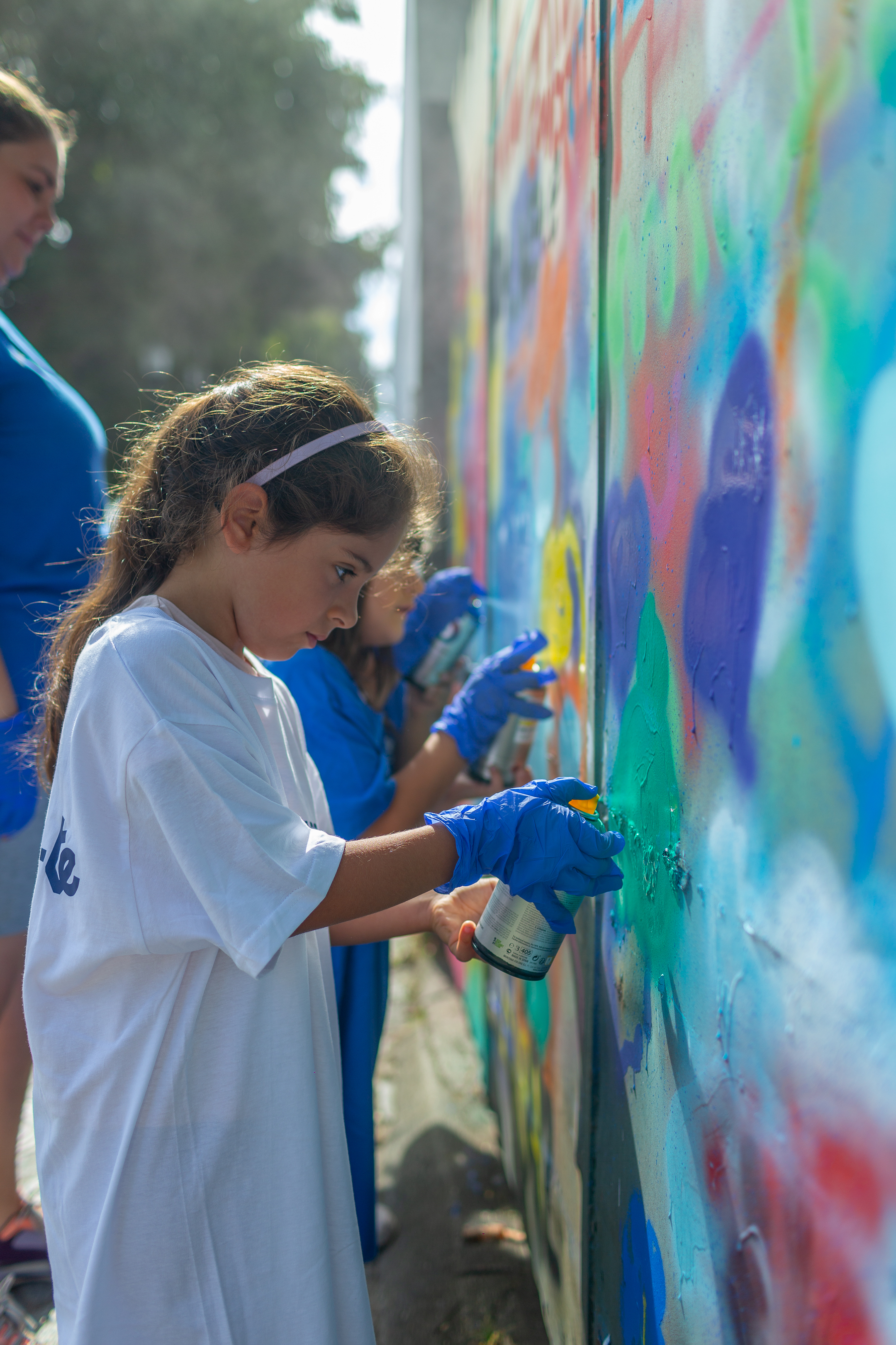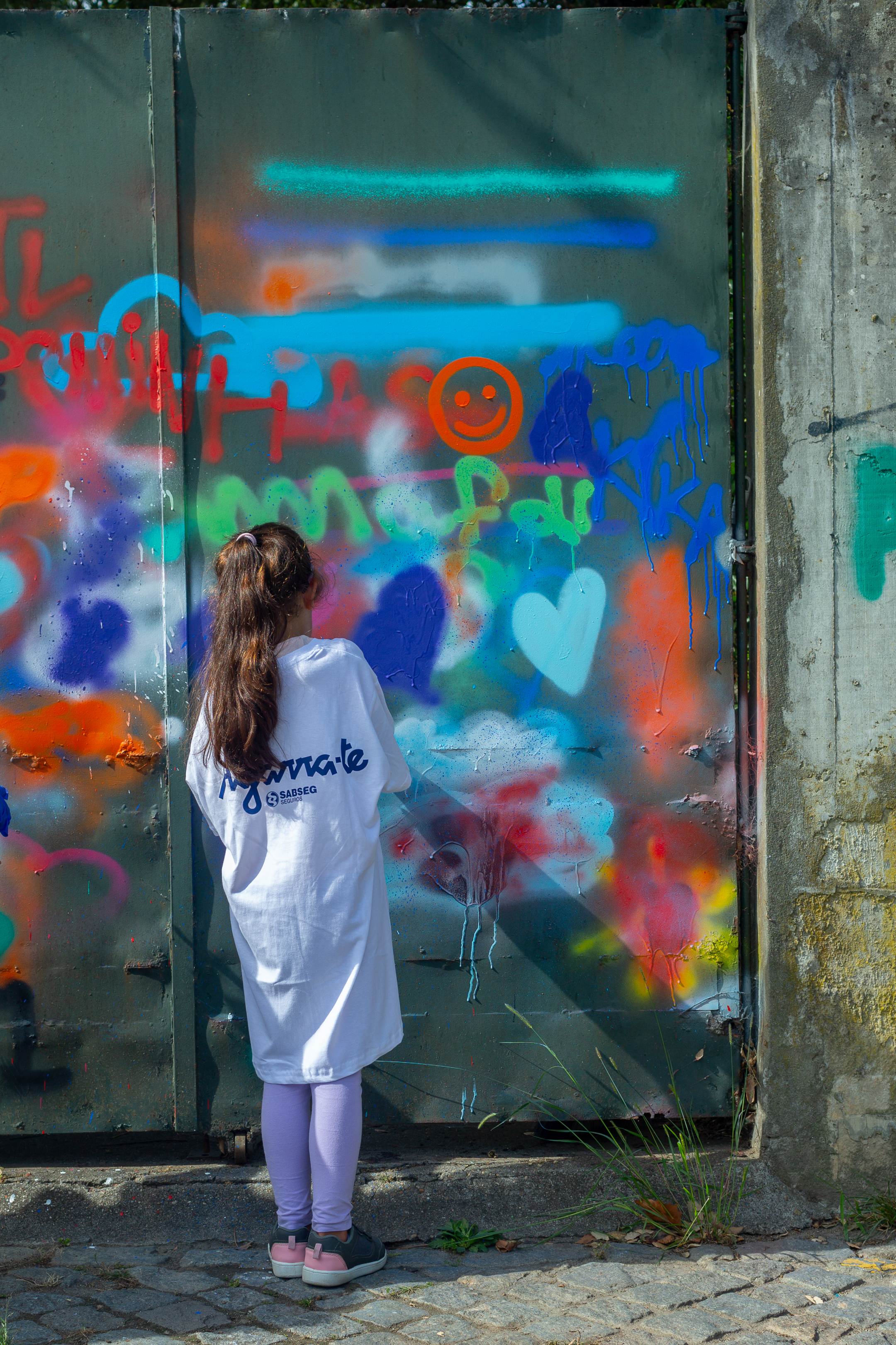 Durante a atividade, as crianças foram divididas em grupos de cinco, de modo a que todas pudessem usufruir do tempo para pintar o portão da instituição com a nossa embaixadora. Experimentaram pintar o mural com latas de tintas de diversas cores e aquilo que mais gostavam e que queriam. Aprenderam que as próprias latas de tinta possuem diversas especificações e tipos, despertando a sua curiosidade e técnica para uma nova realidade no mundo artístico.